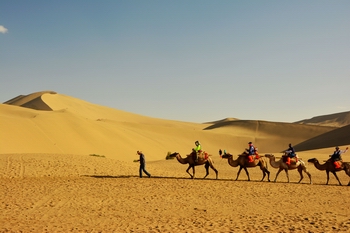 相比于莫高窟的千古惆悵,鳴沙山就輕松愜意多了,騎著駱駝上鳴沙山,耳邊傳來此起彼伏的駝鈴聲,駝鈴聲在過去的無數(shù)歲月中,都是孤寂而悲壯的存在著,試想,漫天黃沙,一望無垠,一隊孤獨的駝隊在沙海中蹣跚而行,前路漫漫,后望無人,是怎樣一種義無反顧才能繼續(xù)走下去?如今的我們斜臥在駱駝上,翹著腳兒四處拍照,閑暇時還和前面帶路的駝工閑聊上幾句,16歲的他和母親相依為命,家里養(yǎng)了八峰駱駝,每天最多的時候可以走三趟,每趟走一個半小時,每峰駱駝賺50元錢,望著他被炙烤的通紅的臉,略帶靦腆的笑容伴著汗水流過面龐,那顆顆汗珠里都包含著這個家庭的明天的希望。