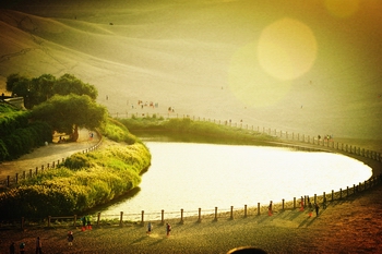 坐落在鳴沙山腹的月牙泉,像顆仙女遺落的玉梳,斜斜淺淺的窩在沙漠中,一彎清泉,漣漪縈回,碧如翡翠。泉在流沙中,干旱不枯竭,風(fēng)吹沙不落,實在是千古奇觀。當?shù)赜袀髡f,當年唐三藏去西天取經(jīng),途徑敦煌,因為是無際的沙漠,沒有水沒有食物,白龍馬已經(jīng)死了(當?shù)赜邪遵R塔就是安葬白龍馬的地方),唐僧艱難跋涉,終于也快要倒下了,此時正被觀世音菩薩看在眼里,為了祝他成功,所以從紫金瓶里滴下一滴金水,瞬間在茫茫沙漠里出現(xiàn)一汪月牙似的清泉,而且泉里還有一種叫“七星草”,可以治百病,后此泉得名“月牙泉”,于是唐僧獲救了,便繼續(xù)向西天前進,月牙泉也一直存留了下來,直到今天。